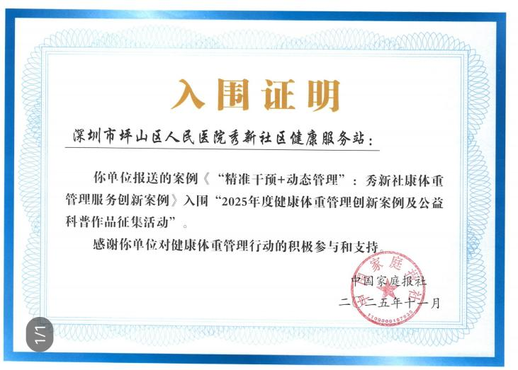 深圳新闻网2025年12月24日讯(记者 曹园芳)近日,坪山区人民医院秀新社康的体重管理服务项目接连斩获三项荣誉——入围由中国家庭报社主办的2025年度健康体重管理创新案例及公益科普作品征集活动、获深圳市第四届“我的示范区我来讲”实践案例优秀奖、获深圳市家庭医生签约服务创新案例二等奖。
