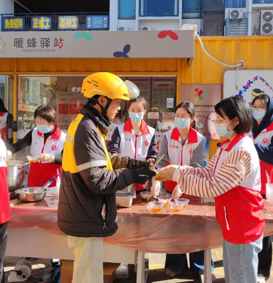 “骑车的时候一定要减速慢行,注意保持车距,还要戴好手套,做好保暖措施……”在大家用餐的同时,志愿者们围在一旁,耐心细致地为他们讲解冬季行车安全、防寒保暖等实用知识。细致的关怀让骑手们奔波的疲惫消散不少,现场不时传来阵阵欢声笑语。