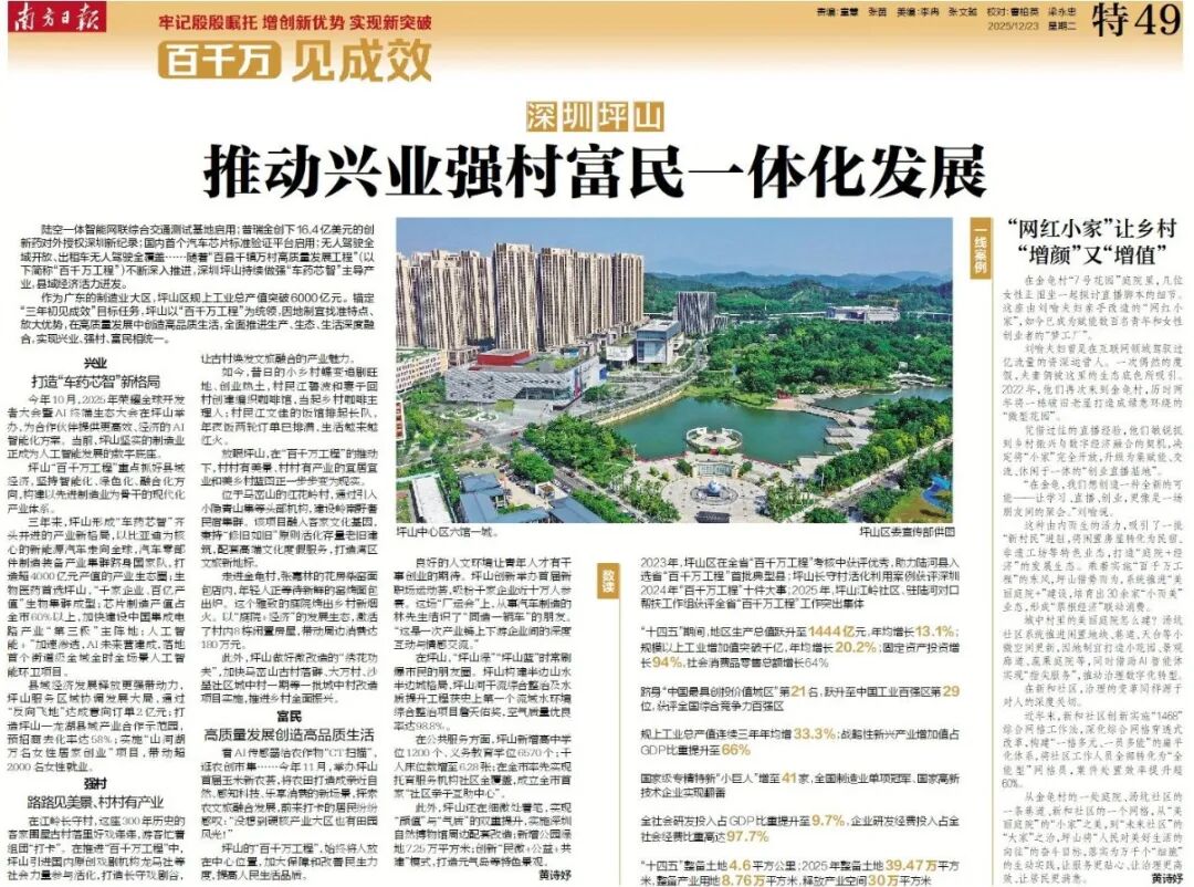 作为广东的制造业大区,坪山区规上工业总产值突破6000亿元。锚定“三年初见成效”目标任务,坪山以“百千万工程”为统领,因地制宜找准特点、放大优势,在高质量发展中创造高品质生活,全面推进生产、生态、生活深度融合,实现兴业、强村、富民相统一。