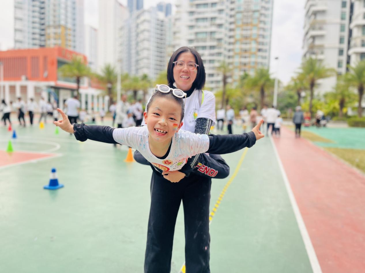 活动精心设计了亲子闯关环节,彩跑路线沿途设置了多个趣味游戏打卡点,将运动能力、亲子默契与协作的考验融为一体。在“一圈到尾”关卡,家长与孩子手拉手,借助双手协作传递呼啦圈;“一撑天地”中,家长们化身为一座座坚固的“拱桥”,守护孩子们勇敢爬行通过;在“一步到位”(小脚踩大脚)、“一飞冲天”(小飞机)、“一扛到家”(抬小猪)及“一起到底”(仰卧起坐叠杯)等综合项目点,更是欢声笑语不断。孩子与家长在奔跑、闯关、集福的过程中尽情体验运动的快乐。活动尾声,孩子们在终点处自豪地为自己挂上了奖牌。