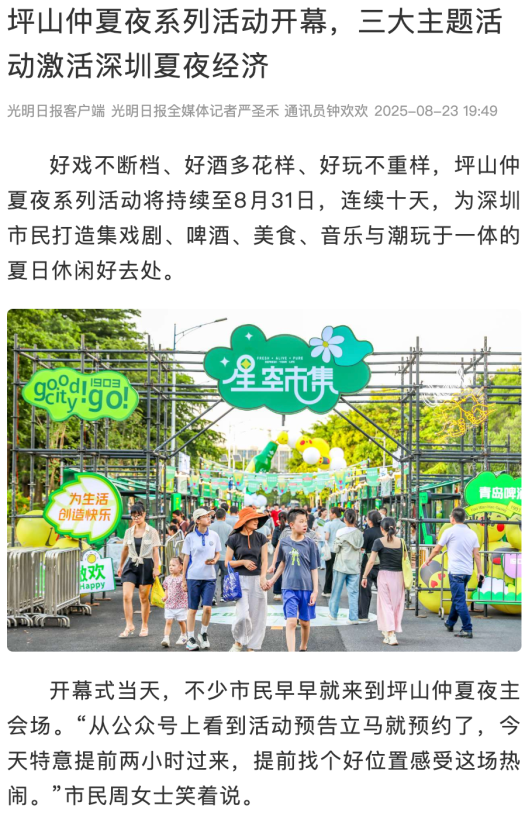 2025年8月23日,光明日报客户端发布《坪山仲夏夜系列活动开幕,三大主题活动激活深圳夏夜经济》。
