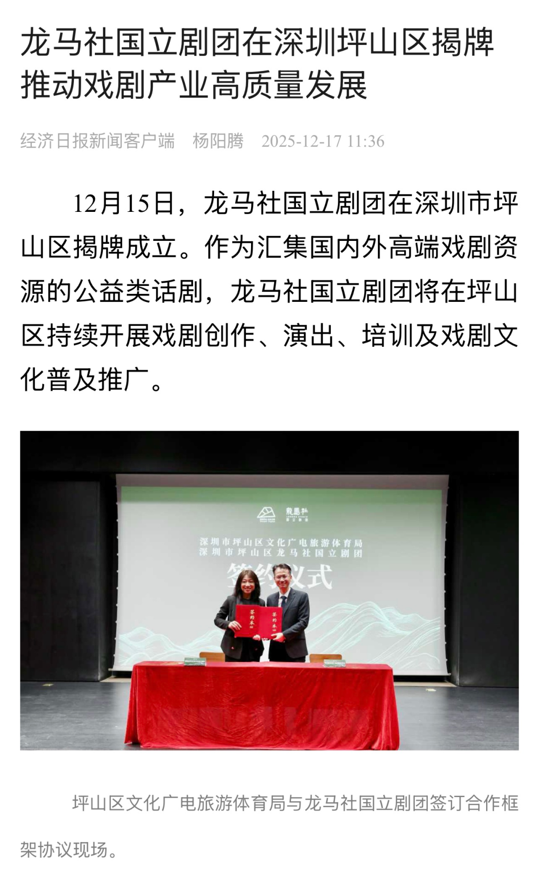 2025年12月17日,经济日报新闻客户端发布《龙马社国立剧团在深圳坪山区揭牌 推动戏剧产业高质量发展》。