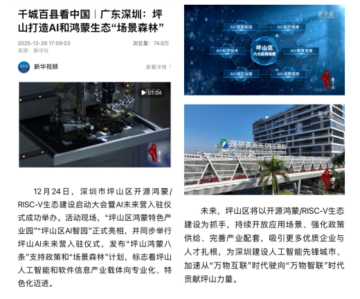 2025年12月26日,新华社发布《千城百县看中国|广东深圳:坪山打造AI和鸿蒙生态“场景森林”》。