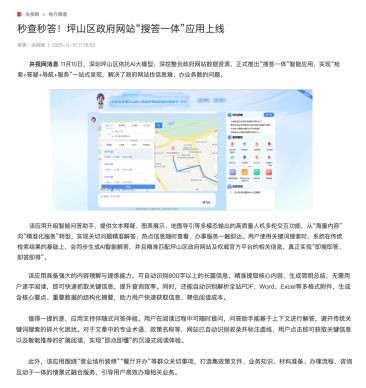 2025年11月13日 ,央视网发布《秒查秒答!坪山区政府网站“搜答一体”应用上线》。
