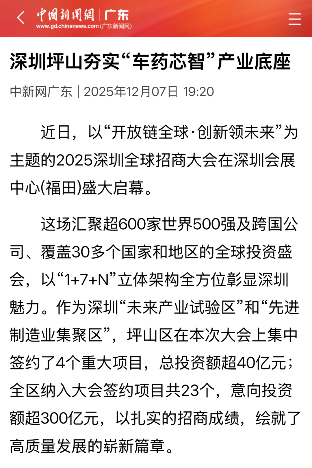 2025年12月7日,中新网广东发布《深圳坪山夯实“车药芯智”产业底座》。