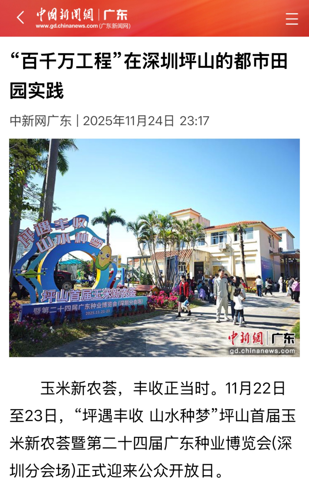 2025年11月24日,中新网广东发布《“百千万工程”在深圳坪山的都市田园实践》。