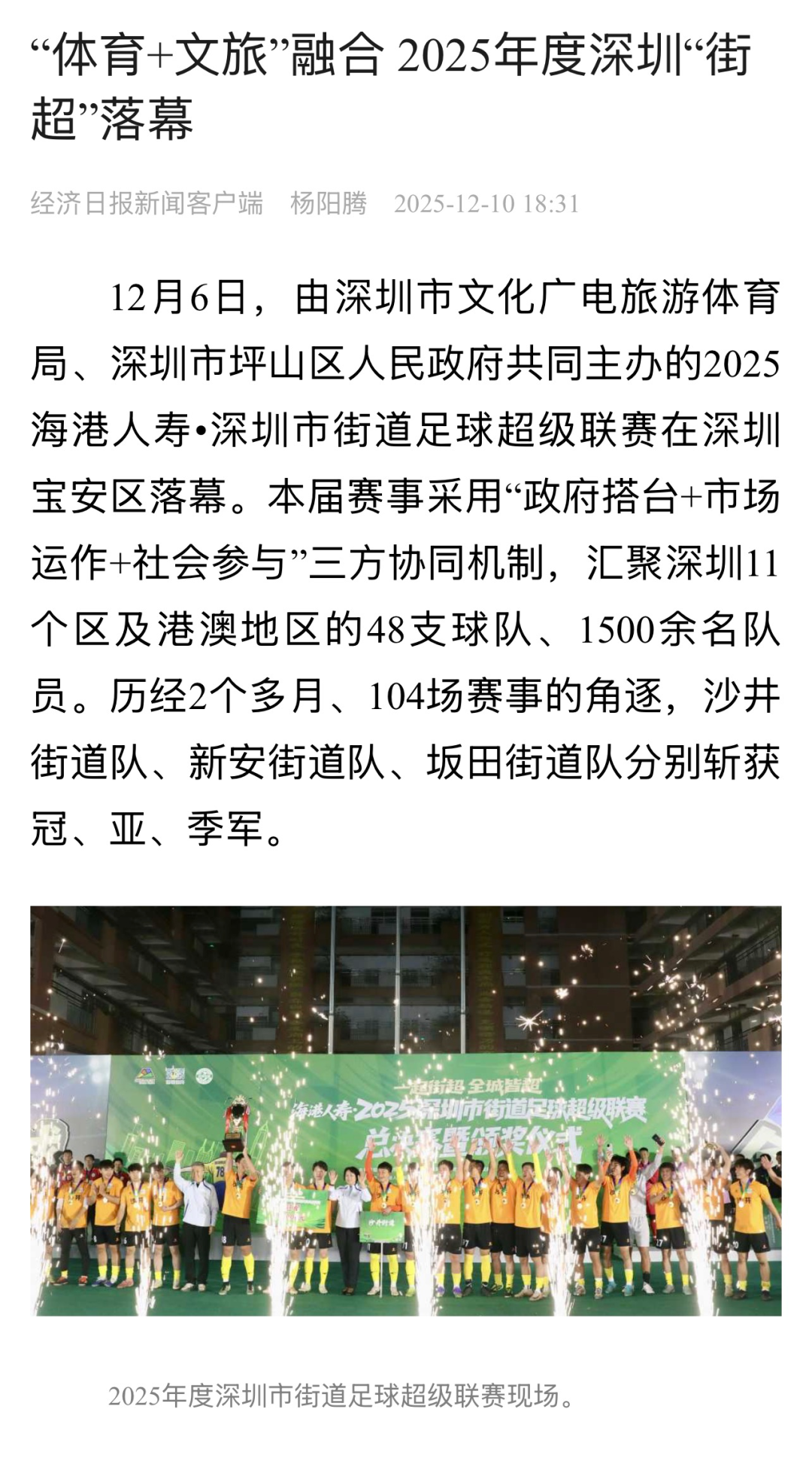 2025年12月10日,经济日报新闻客户端发布《“体育+文旅”融合 2025年度深圳“街超”落幕》。