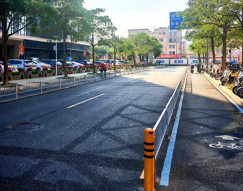 坪山区针对既有道路资源,通过精细化设计充分挖掘空间潜力。根据道路宽度、沿线业态及车流量等实际情况,采用压缩机动车道、取消路侧停车位、优化交通组织等方式增设独立非机动车道。例如,杜岗路通过缩减机动车道数量,联旺二街通过取消路侧停车位,均成功增设了独立非机动车道,有效分离机非交通流,提升骑行安全性。