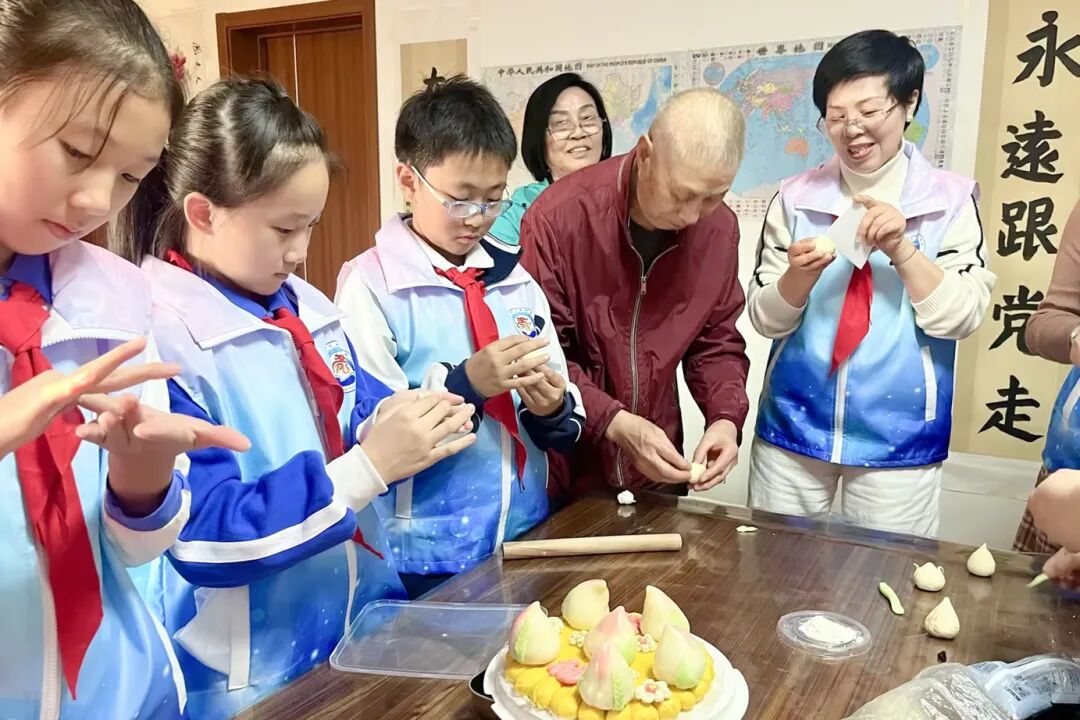 队员们亲手制作寿桃敬献老兵,一双双稚嫩的小手牵起老兵布满岁月痕迹的大手,孩子们用童真的问候、真诚的陪伴,为老前辈们送去温暖与慰藉。老兵们将保家卫国的赤诚初心与艰苦奋斗的优良作风,化作鲜活的精神养分传递给少年一代。