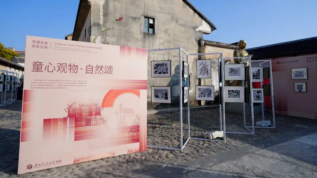 本次展览共展出约160件学生版画作品,分为四大主题版块,构建了一个从围屋在地文化到浩瀚想象,从传统手艺到自然生命的立体美育世界。“围屋印记·客家韵”以刻刀镌刻大万世居的瓦楞、天井、门窗,完成一次从文化现场出发的“在地感知”;“神话再现·山海情”通过版画、数字建模与3D打印,让《山海经》中的远古神兽在当代“活”起来,“非遗新生·手艺传”将皮影、剪纸、中医药等非遗元素,转化为充满童趣的当代艺术表达;“童心观物·自然颂”以纯真视角描绘中国龙与珍稀动物等,传递对自然万物与民族文化的礼赞。