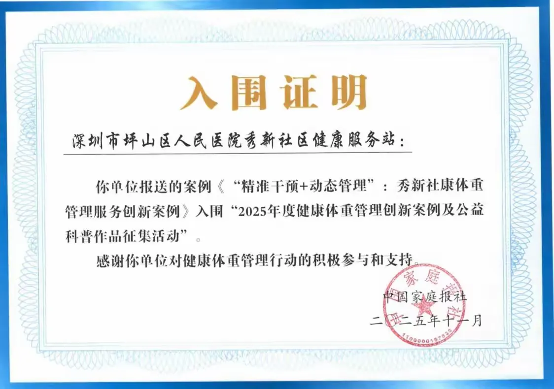荣誉不止步,创新无止境。2025年11月,秀新社康申报的《“精准干预+动态管理”:秀新社康体重管理服务创新案例》,成功入围由中国家庭报社主办的全国性征集活动——“2025年度健康体重管理创新案例及公益科普作品征集活动”,让坪山区的基层医疗创新成果在国家级平台精彩亮相,展现了区级医疗服务的全国竞争力。