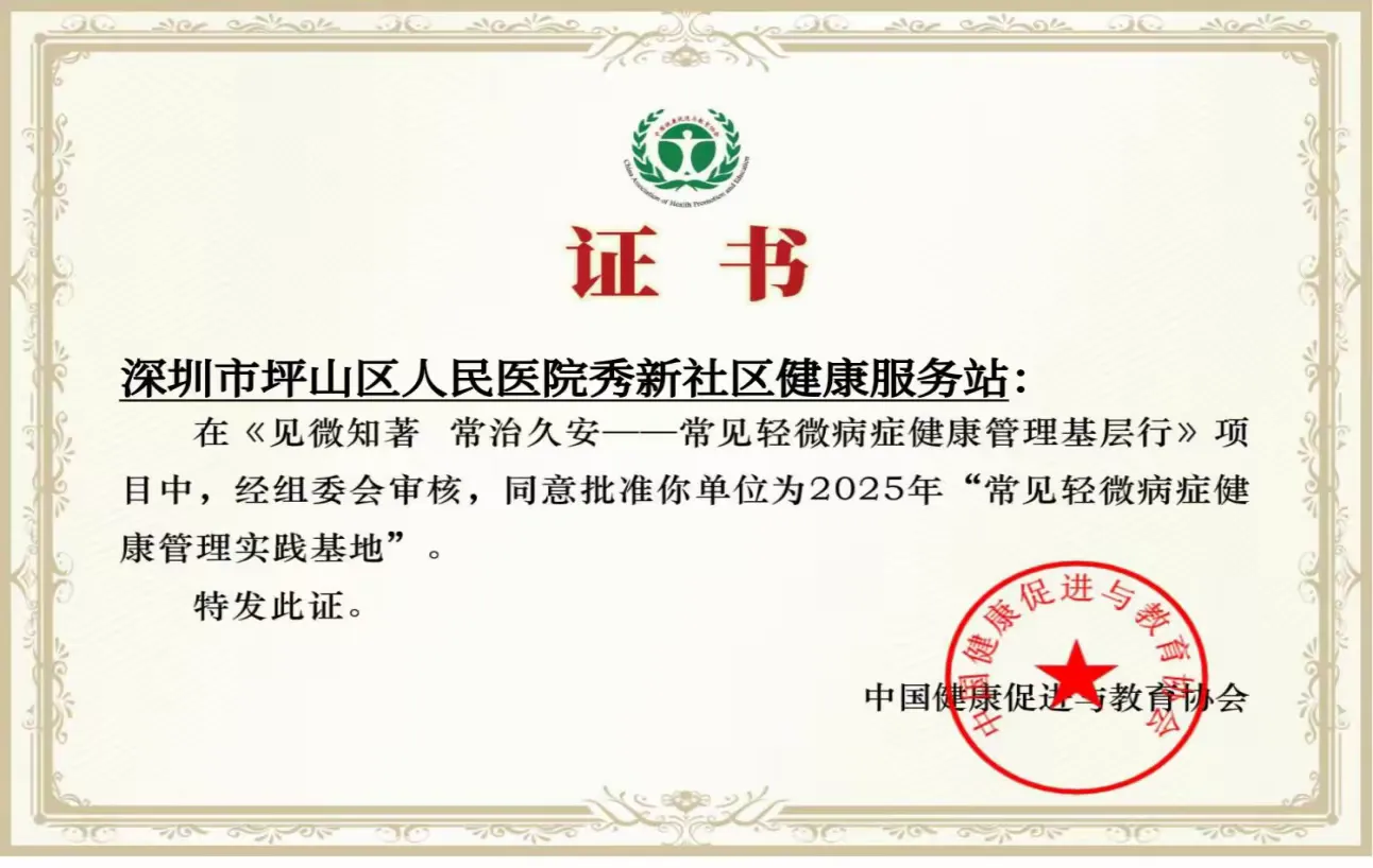 更值得骄傲的是,秀新社康凭借在基层健康管理领域的扎实积累与创新实践,被中国健康促进与教育协会正式批准为2025年“常见轻微病症健康管理实践基地”。这一国家级资质的落地,为坪山区后续开展相关健康管理工作搭建了更高的平台,拓展了更广阔的发展空间。