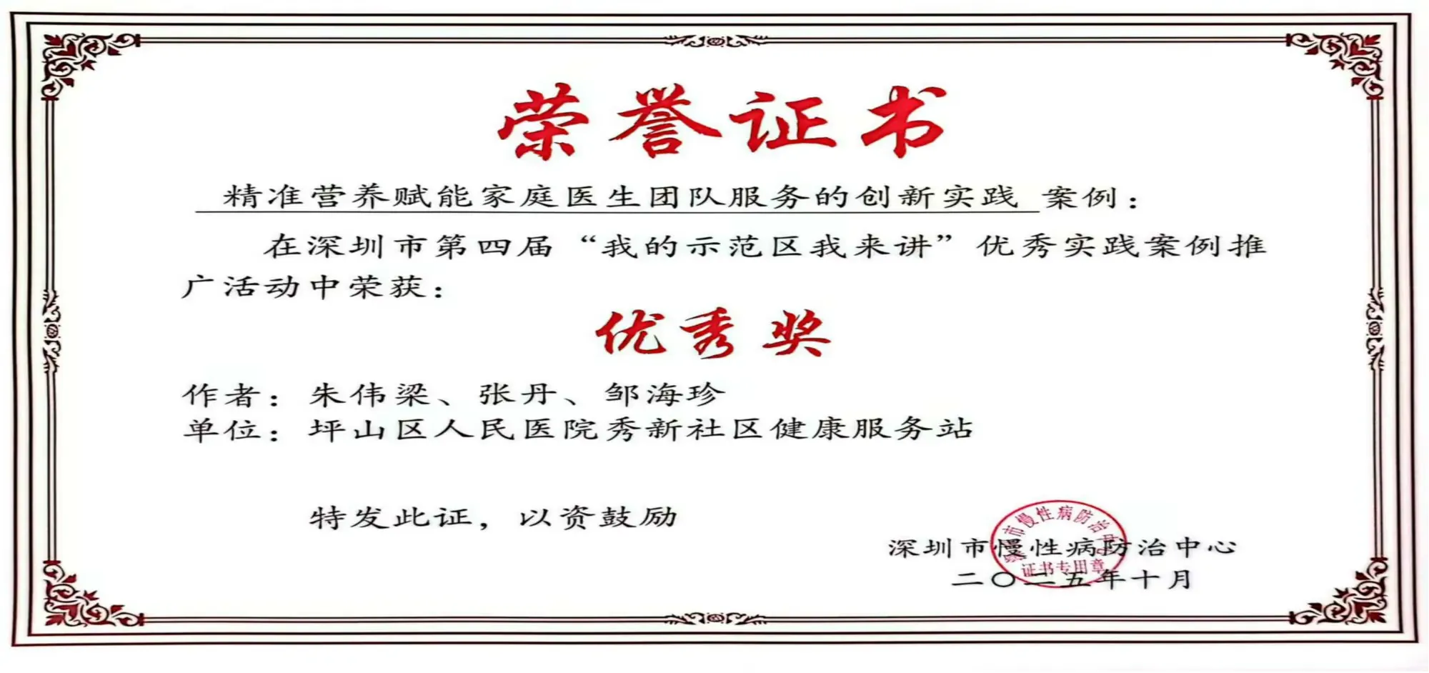 2025年5月,秀新社康团队的《精准营养与家庭医生服务的创新实践》案例,经过层层筛选,被深圳市卫健委评选为“深圳市2024年家庭医生签约服务高质量发展十大优秀创新案例”,标志着坪山区的基层医疗服务模式在全市范围内树立了示范标杆,具备了广泛推广价值。