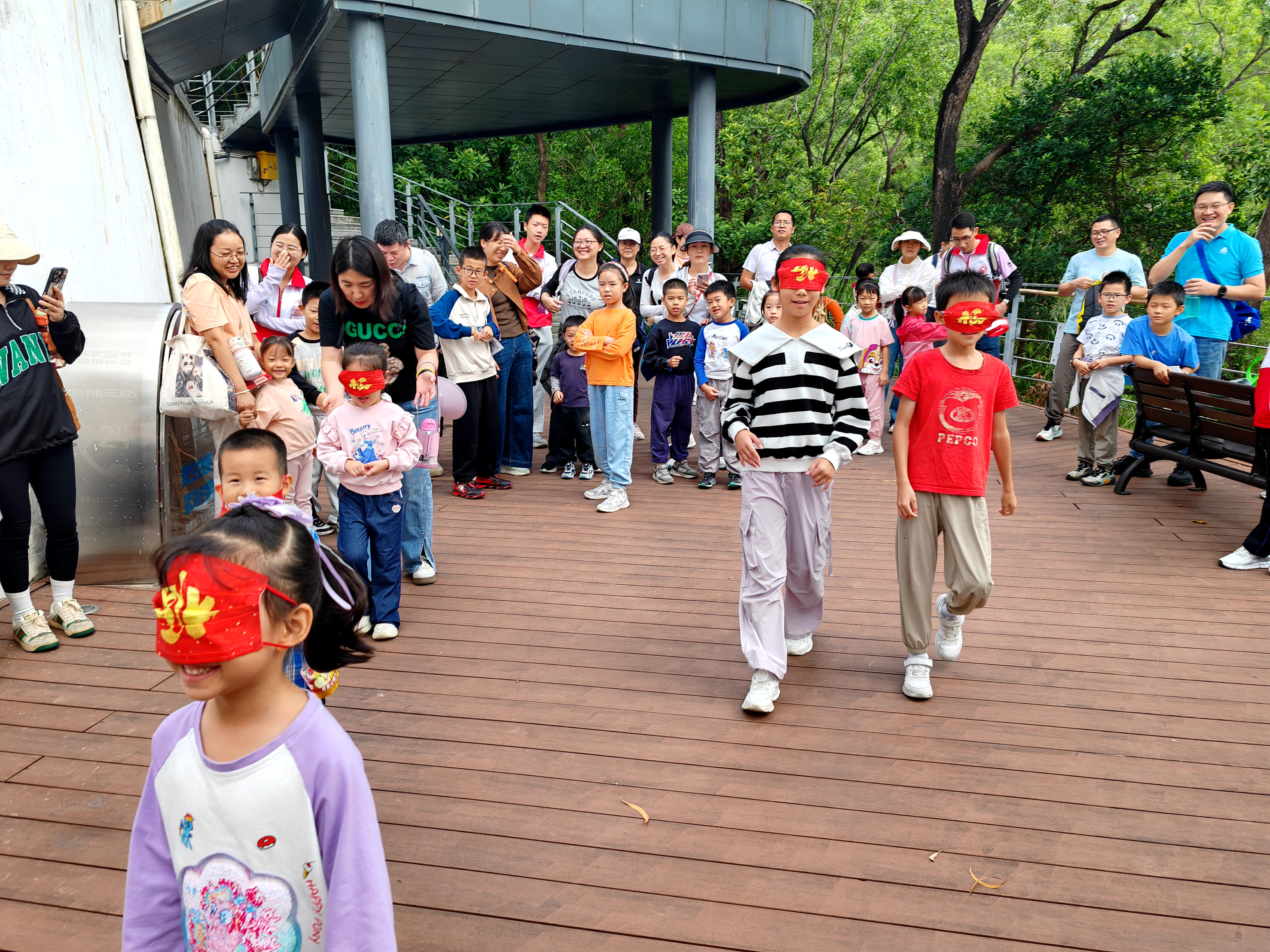 行至观景台,社工组织“蒙眼走直线”趣味游戏——孩子们蒙起双眼,依靠父母口令前行。这一环节不仅考验默契,更在欢乐中悄然加深亲子信任与情感联结。一个个有趣的环节让各个家庭沉浸其中,意犹未尽。活动结束时,不少家长争相询问:“下次活动的任务卡可以提前推送吗?孩子说周末还想再来。”