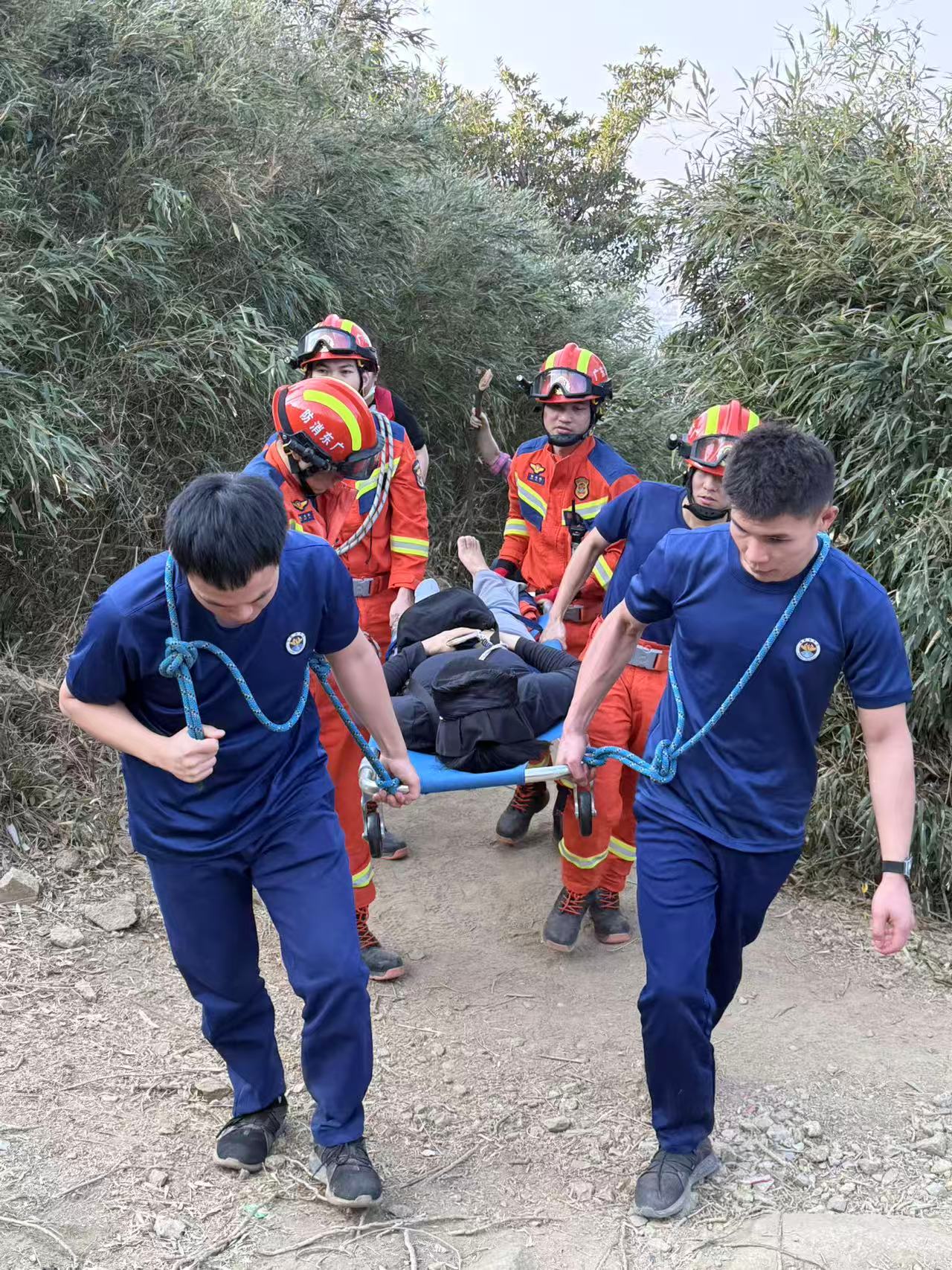打鼓嶂山地形复杂,山路陡峭狭窄且碎石遍布,给救援行进带来极大阻碍。经过一个多小时的艰难攀爬,应急队员顺利抵达伤员所在位置,此时,消防员也已同步赶到现场进行救援。经初步检查,两名被困群众腿部均有不同程度扭伤,行动困难。救援人员一边耐心安抚伤者情绪,一边迅速对伤者腿部进行简易固定处理。综合研判地形条件与伤者身体状况后,救援队伍决定使用折叠担架分批护送伤员下山。