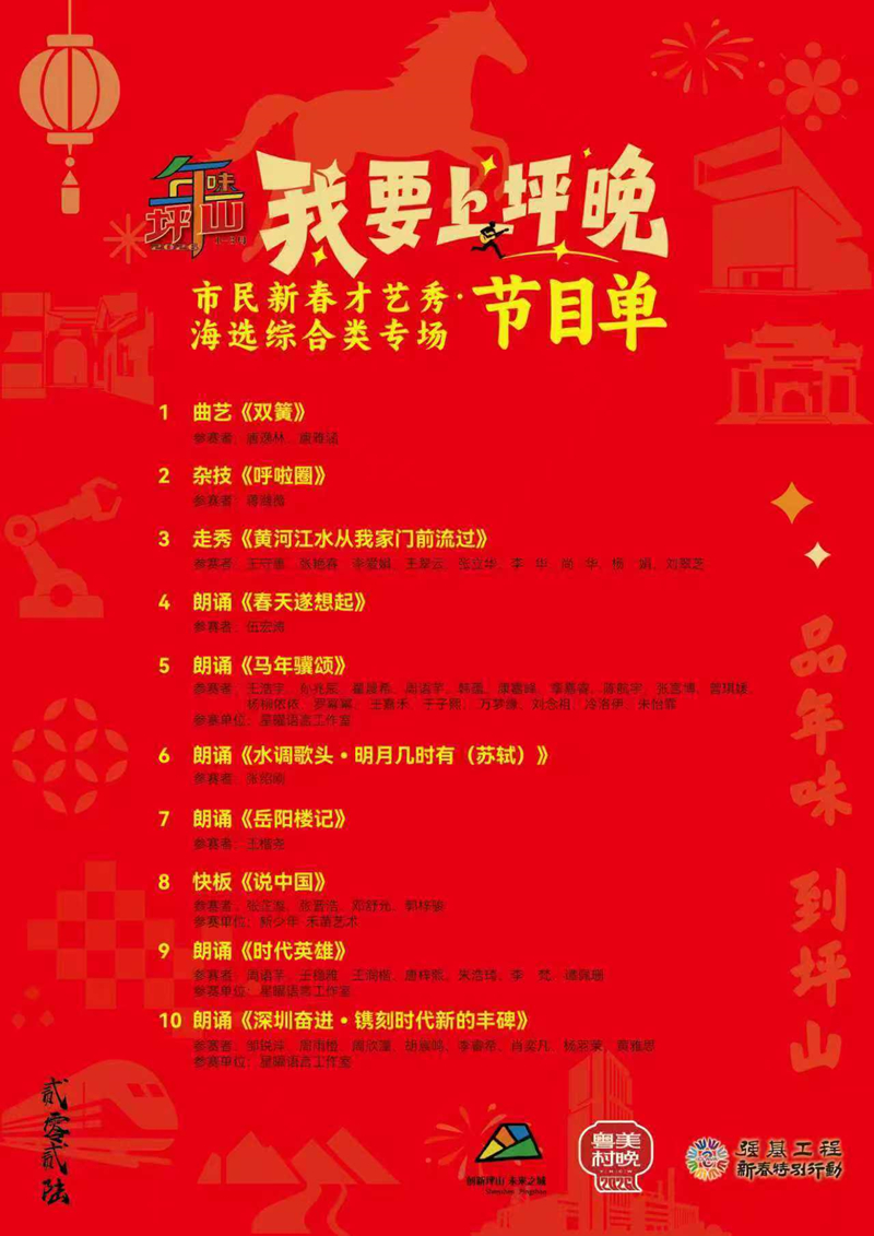由坪山区文化馆与龙田街道联合主办,“我要上坪晚”盘龙世居分会场将在古韵满满的盘龙世居拉开文化节序幕!10个特色节目轮番上演,用精彩演绎点燃冬日激情,沉浸式感受本土文化的独特魅力,开场就氛围感拉满,千万别错过~