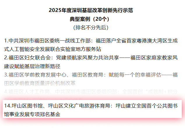 深圳新闻网2026年1月24日讯(记者 杨涛)近日,由坪山区文化广电旅游体育局与坪山图书馆共同推动成立的“全国首个公共图书馆事业发展专项冠名基金”,成功入选“2025年度深圳基层改革创新先行示范典型案例”。