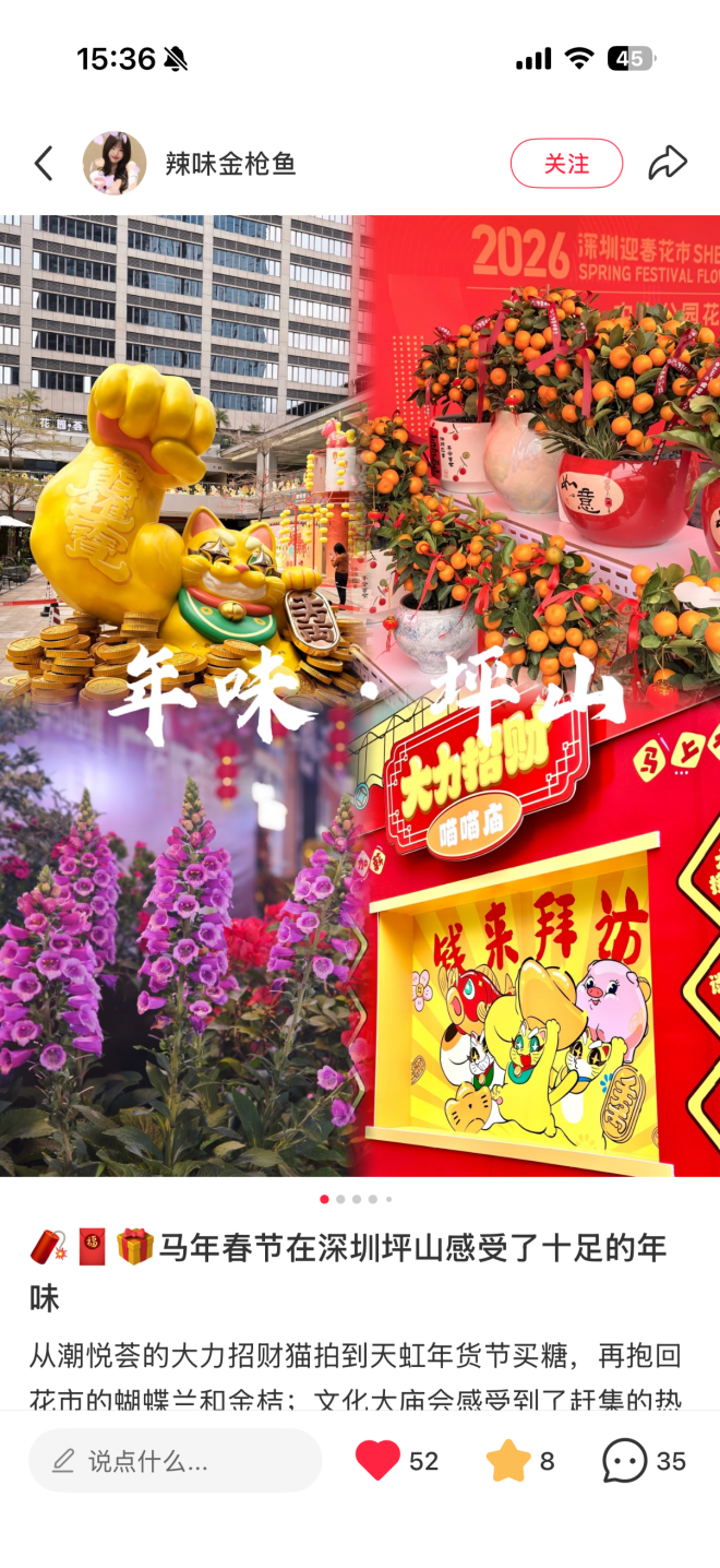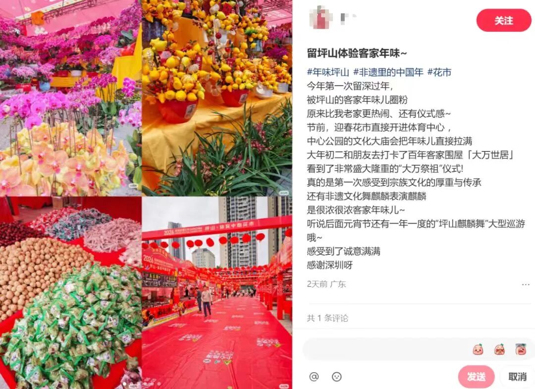 深圳新闻网2026年2月24日讯(记者 杨涛)“马年春节在深圳坪山感受到了十足的年味”“今年春节的仪式感,是坪山给的!”“今年第一次留深过年被坪山的客家年味儿圈粉”……这个马年新春,诸如此类的走心分享频频出现在社交平台,“坪山有年味!” 成为每一位在坪山过大年的市民游客心底最强烈的共鸣,也化作刷屏网络的一句句由衷赞叹。
