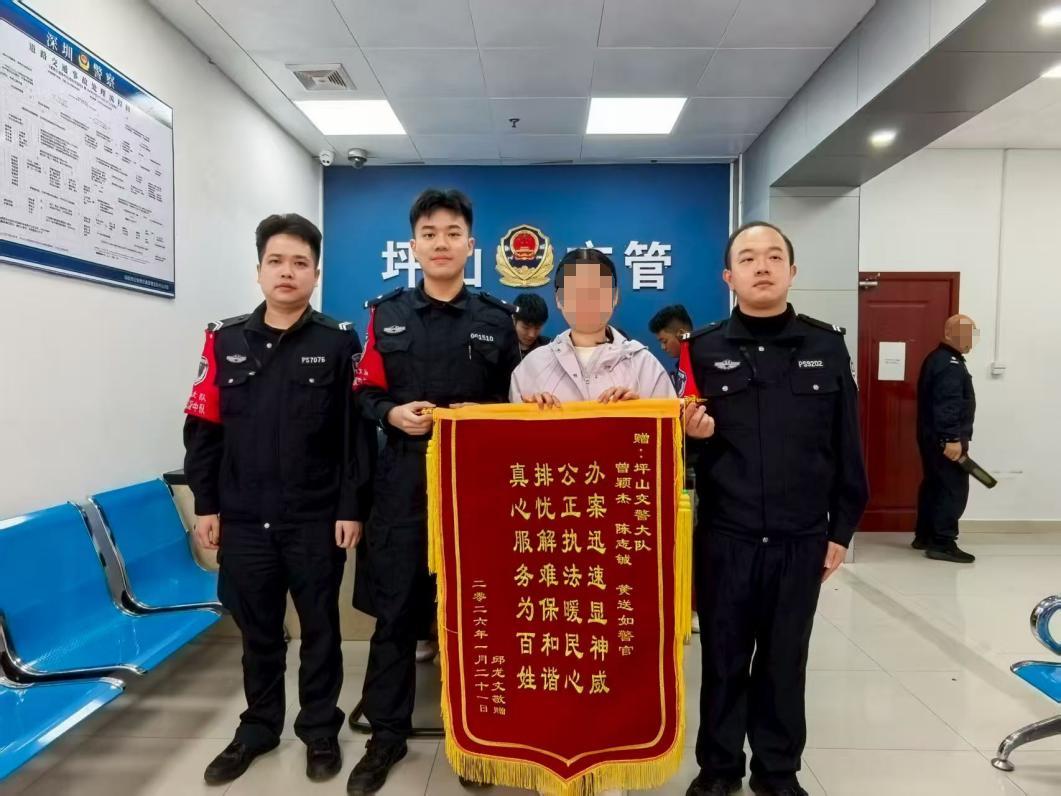 近日,小车车主的家属专程来到坪山大队赠送锦旗,对民警快速破案的专业素养予以高度肯定,对坪山大队切实维护群众合法利益的工作成效表达感谢。