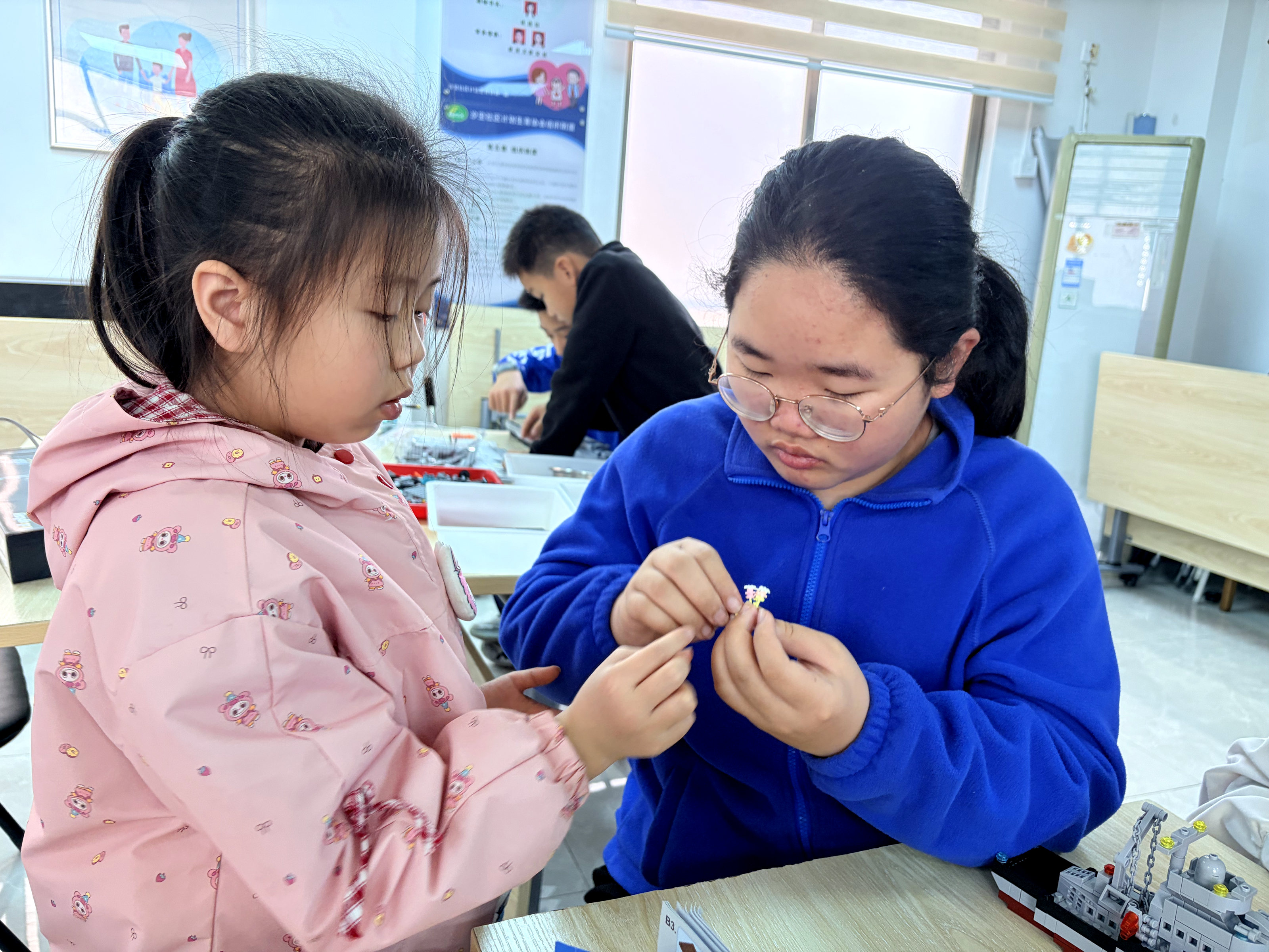 活动以环保多元材料为媒介,引导孩子们发挥想象力,将手工材料转化为富有童趣的艺术作品。在党群社工的耐心引导下,孩子们从最初的陌生拘谨,到逐渐学会商量分工、互相协助,共同完成“友谊树”“环保梦想街边小铺”等主题集体创作。最令人动容的是作品分享环节。孩子们自信地走到台前,讲述创作思路与过程中的小故事:“我做这片叶子的时候,一直找不到合适的积木,是我的组员把他多余的配件给我,我们一起完成的。”“我们小组商量好了,房子要用很多颜色,我们的想法虽然不一样,但在一起也很漂亮。”朴素的言语中,流露出协作的快乐与友谊的萌芽。