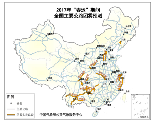 2017年“春运”期间全国主要公路团雾预测