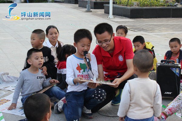 当天下午两点半,社工和义工带领社区15对亲子来到美丽的坑梓聚龙山。先是好玩的热身游戏“我是小小千足虫”;尔后,是有精美礼品赠送的有奖问答环节;接着,社工鼓励15对亲子独自完成以“儿童安全”为主体的现场画创作;最后,小朋友们分享了自己的作品并在儿童安全主题板上署名。