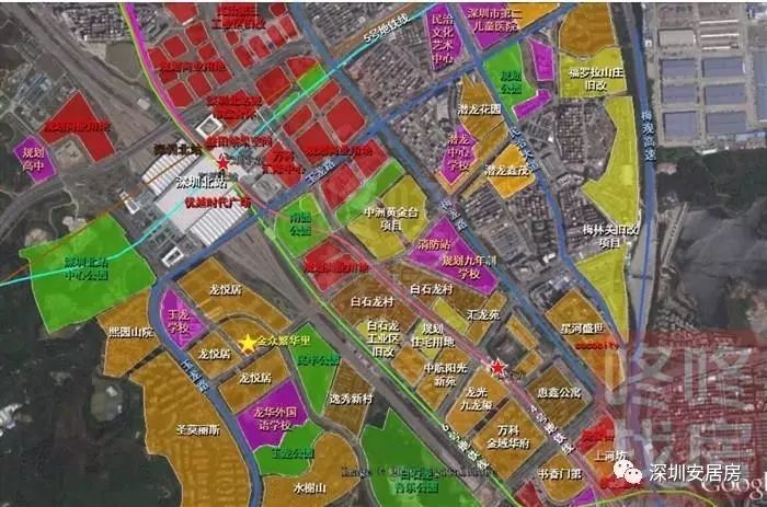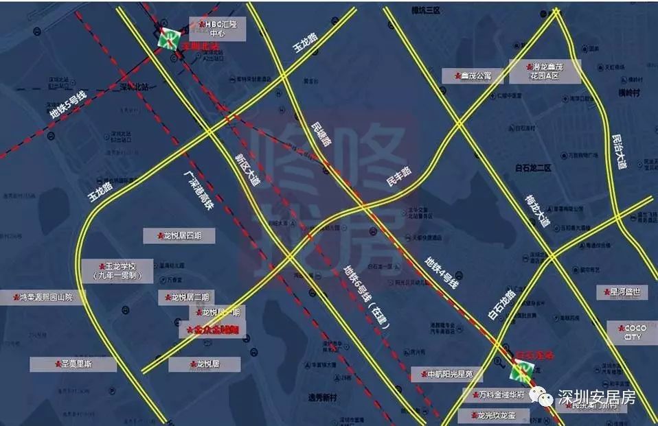 此外,项目的商品房项目包括玉龙路西侧的鸿荣源熙园山院、圣莫里斯别墅区、玉龙路北侧的万科与深铁合作开发的HBC汇隆中心,及白石龙地铁站附近的,中航阳光新苑、万科金域华府、龙光玖龙玺等。