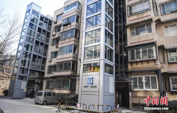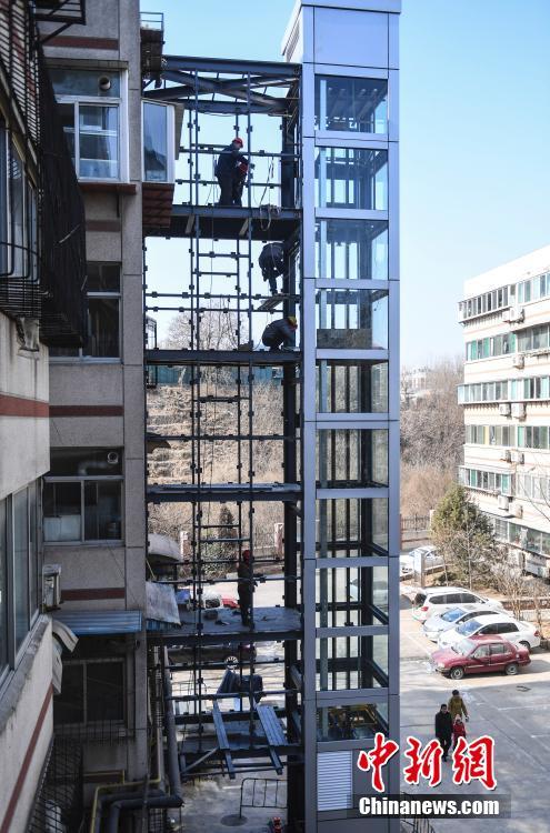 1月23日,工作人员正在安装另一部老楼的“加装电梯”。当日,济南首部老小区居民楼加装电梯投入使用,吸引不少居民乘坐电梯,体验便利。
